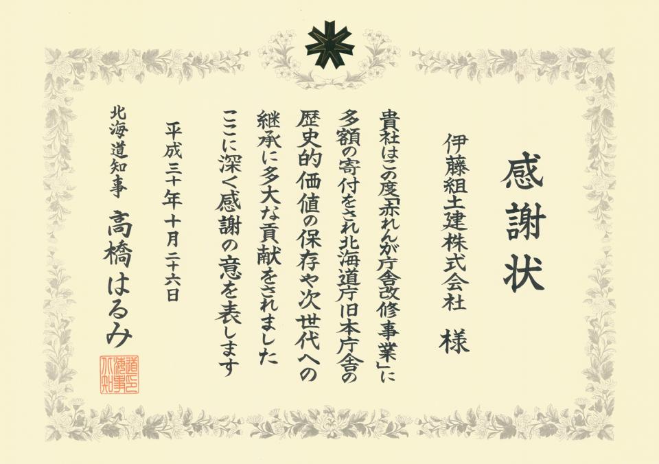お知らせ ホーム お知らせ一覧 「赤れんが庁舎改修事業」への寄付で、高橋知事より感謝状が授与されました。 CSR2018.10.31「赤れんが庁舎改修事業」への寄付で、高橋知事より感謝状が授与されました。平成30年10月26日、高橋はるみ知事より赤れんが庁舎改修事業の寄付に対して感謝状が授与されました。 「赤れんが庁舎改修事業」とは、北海道命名150年目となる2018年を契機に、先人から受け継いだ「赤れんが庁舎」の歴史的価値を保存し次世代に引き継ぐため、大規模改修を行なうものです。 赤れんが庁舎改修事業は、平成31年着工、平成34年完成の予定です。 前へお知らせ一覧に戻る一覧に戻る次へ