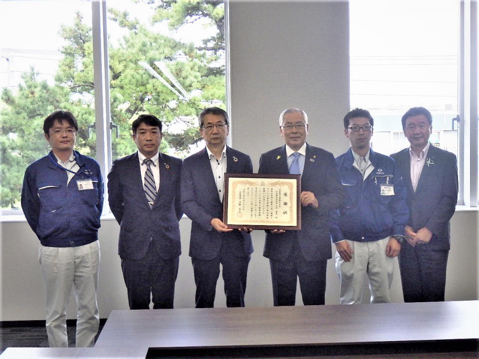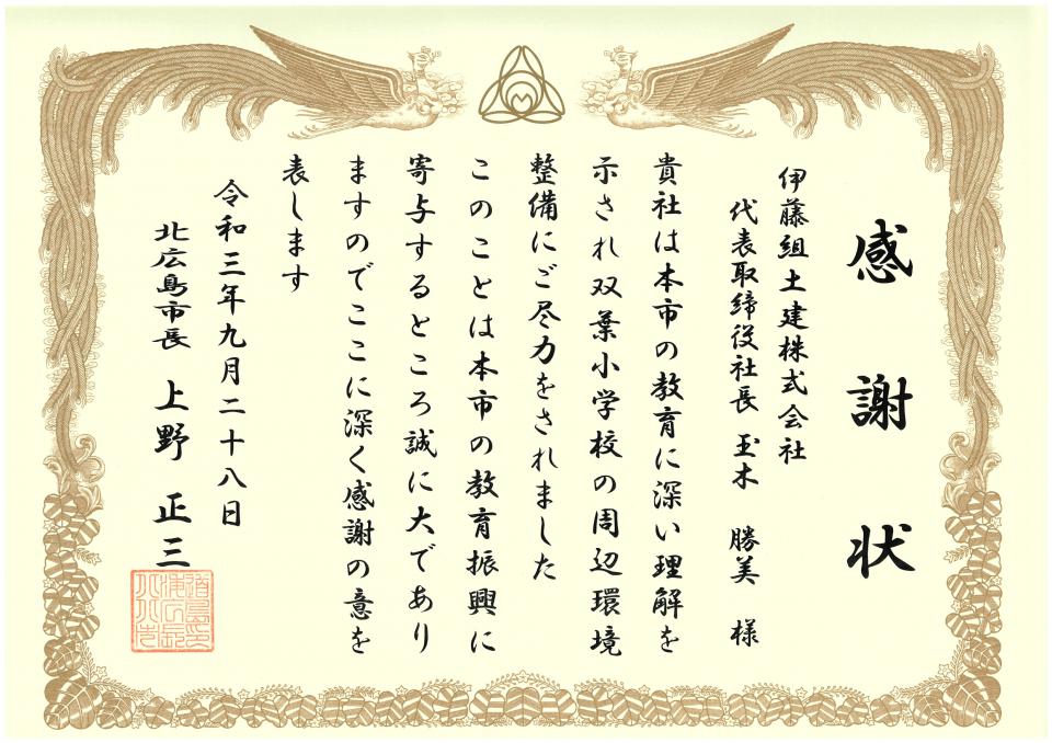 お知らせ ホーム お知らせ一覧 北広島市での社会貢献活動に対し感謝状が授与されました CSR2021.10.06北広島市での社会貢献活動に対し感謝状が授与されました令和3年7月30日、31日と8月2日に、北広島市若葉町の市立双葉小学校で、敷地内に繁茂していた樹木の剪定と 立枯れ木の伐採を行いました。 敷地の外周に繁茂した樹木の枝が架空線に接触したり、外周フェンスを越えるなどの大きな支障が出ており、立枯れ した大木はいつ倒れてもおかしくない危険な状況でした。作業は、安全確保のため、夏休み期間中に実施しました。 この社会貢献活動に対し、9月28日に北広島市より感謝状が授与されました。 前へお知らせ一覧に戻る一覧に戻る次へ