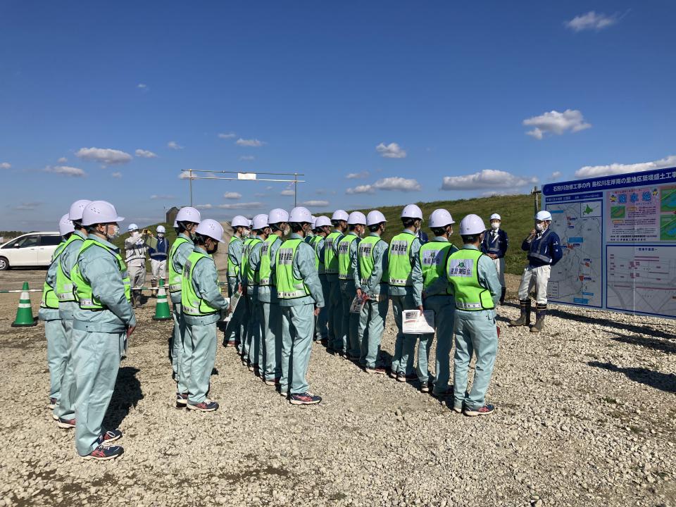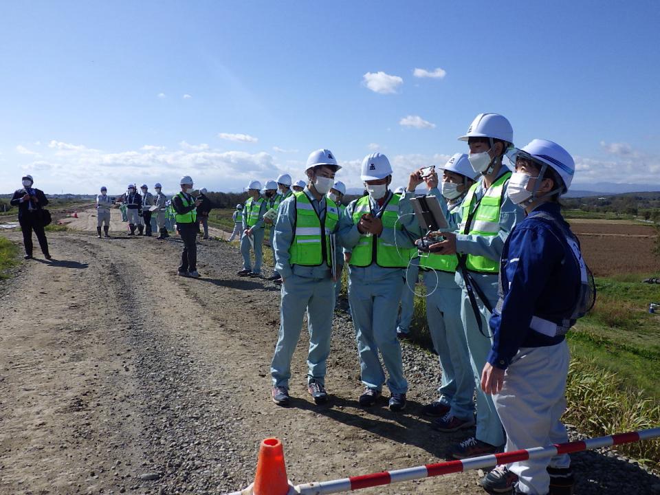 札幌建設業協会主催の高校生を対象とした現場見学会が、弊社施工の「石狩川改修工事の内 島松川左岸南の里地区築堤盛土工事」現場で行われました。現場では、一方井所長から施工内容について説明を行ったあと、ドローンの操縦体験を実施しました。生徒一人ひとりにドローンの操縦方法を説明し、実際に生徒自らドローンを操縦して現場の作業風景を写真に収めるなどの体験をしてもらいました。