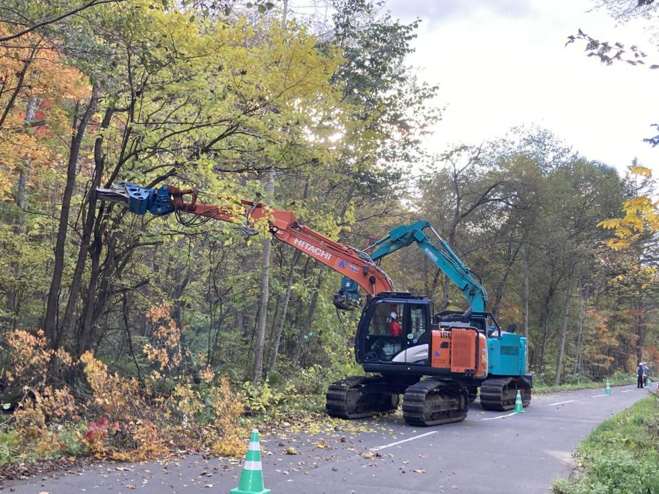 樹木の伐採と伐木作業は、JV現場職員、作業員と交通誘導員の総勢9名と重機や産廃運搬車など5台を使用し、3日間かけて