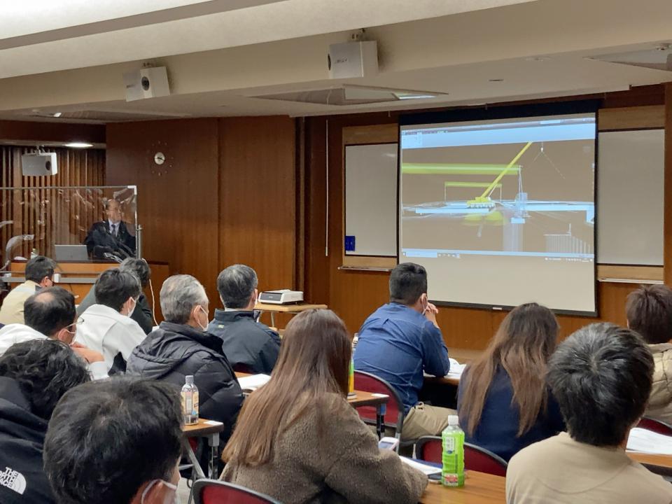 講習会当日は、約80名の参加者に弊社の土木工事で活用した3次元モデルを実際に動かしながら事例発表を行いました。