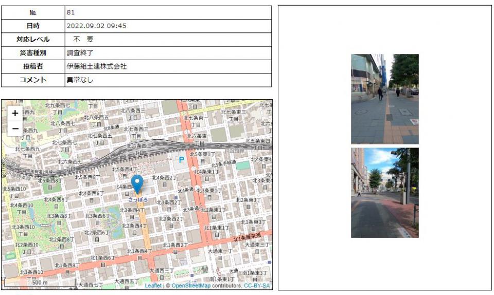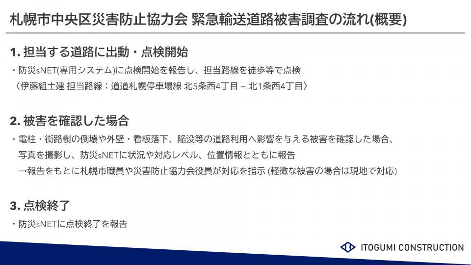 弊社は、平成22年より札幌市中央区災害防止協力会に参加し、札幌市中央区土木部や他の参加企業とともに万一の災害発生を想定した訓練などを実施しており、今年度は「緊急輸送道路被害調査訓練」を実施しました。訓練は、石狩地方中部を震源としたマグニチュード7.3の直下型地震の発生を想定し、各参加企業が担当する中央区緊急輸送道路の被災状況を遠隔で伝達するもので、弊社も担当する札幌駅前通の点検・情報収集を行いました。