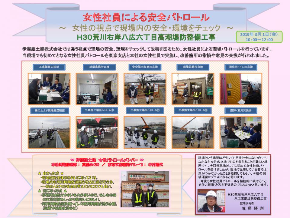 平成31年3月1日(金)、本社と東京支店の女性社員2名により、現在当社で施工中のH30荒川右岸八広六丁目高潮堤防整備工事作業所の安全パトロールを行いました。この女性パトロールは、いつもと違う視点で現場の安全や環境をチェックするために行なうもので、東京支店管轄の工事としては初めて実施されました。