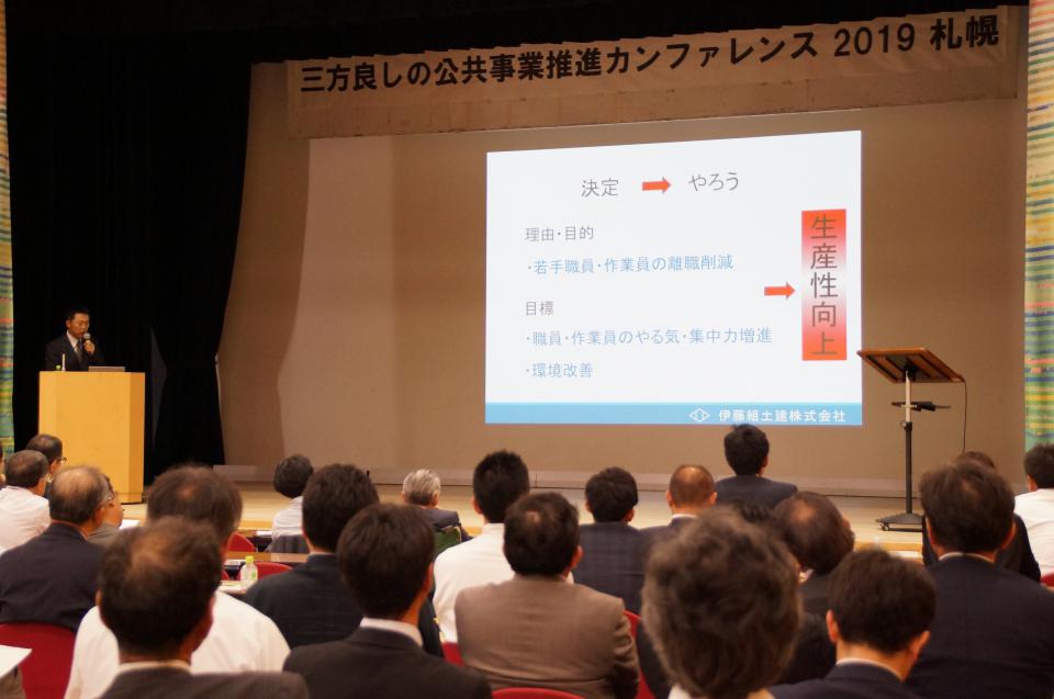 お知らせ ホーム お知らせ一覧 「働き方改革と生産性向上への挑戦」事例発表 お知らせ2019.06.26「働き方改革と生産性向上への挑戦」事例発表 令和元年6月18日(火)、地域住民に公共事業を理解・協力してもらうための活動を支援する「三方良しの公共事業推進研究会」が主催した「三方良しの公共事業推進カンファレンス2019札幌」において、土木部工事課の斎藤直樹所長が、「働き方改革と生産性向上への挑戦」と題し、現場における週休2日制度の取組みと創意工夫事例について事例発表を行いました。 前へお知らせ一覧に戻る一覧に戻る次へ