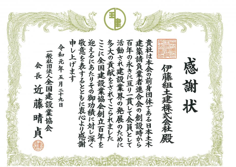 お知らせ ホーム お知らせ一覧 全建100年継続会員特別表彰を受賞しました 受賞2019.08.02全建100年継続会員特別表彰を受賞しました令和元年7月25日、北海道建設会館にて「100年継続会員に対する特別表彰」の伝達式が行なわれました。 この特別表彰は、前身組織の日本土木建築請負業者連合会が1919年(大正8年)の創立から今年で100年を迎えるのを機に創設されたもので、道内では唯一当社が受賞しました。 前へお知らせ一覧に戻る一覧に戻る次へ