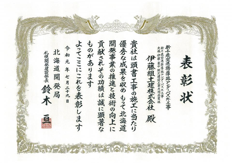 お知らせ ホーム お知らせ一覧 北海道開発局から表彰状を頂きました(新千歳空港誘導路アンダーパス工事) 受賞2019.08.06北海道開発局から表彰状を頂きました(新千歳空港誘導路アンダーパス工事)本工事は、新千歳空港において南側誘導路の整備に伴い、一部道路をアンダーパス化することで空港内の交通動線を確保する目的で施工しました。工期短縮の工夫として、鉄筋筋のユニット化や足場一体型大型型枠を採用しました。また、コンクリートのひび割れ対策の創意工夫も行い、発注者から高い評価を頂きました。 前へお知らせ一覧に戻る一覧に戻る次へ