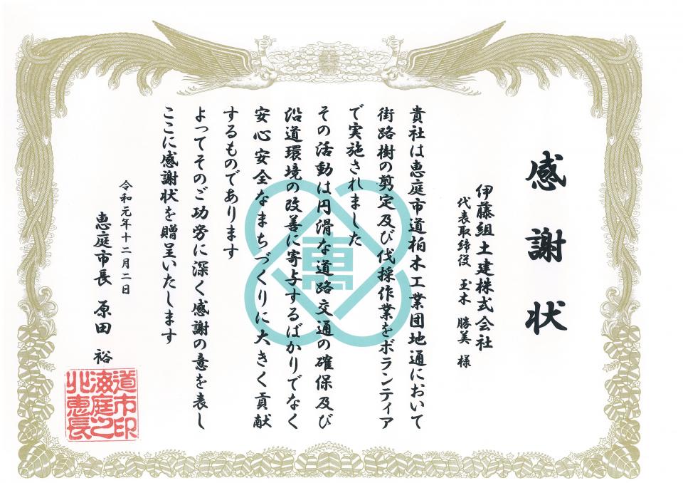お知らせ ホーム お知らせ一覧 恵庭市長より感謝状を頂きました CSR2019.12.02恵庭市長より感謝状を頂きました令和元年12月2日、恵庭市長より感謝状を頂きました。 この感謝状は、恵庭市道柏木工業団地通において 街路樹の剪定及び伐採作業をボランティアで実施し、 安心安全なまちづくりに大きく貢献したことに対して贈られました。 前へお知らせ一覧に戻る一覧に戻る次へ