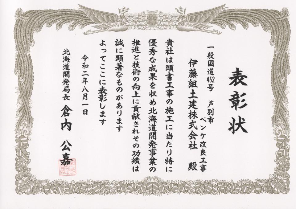 お知らせ ホーム お知らせ一覧 北海道開発局 局長表彰を受賞しました。 受賞2020.09.15北海道開発局 局長表彰を受賞しました。令和2年9月11日、国立民族共生公園体験ホール、芦別市ペンケ改良工事において北海道開発局より局長表彰を受賞しました。 この表彰状は、施工にあたり特に優秀な成果を収め、北海道開発事業の推進と技術の向上に貢献したことに対して贈られました。 受賞歴一覧へ前へお知らせ一覧に戻る一覧に戻る次へ