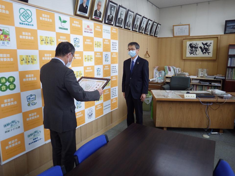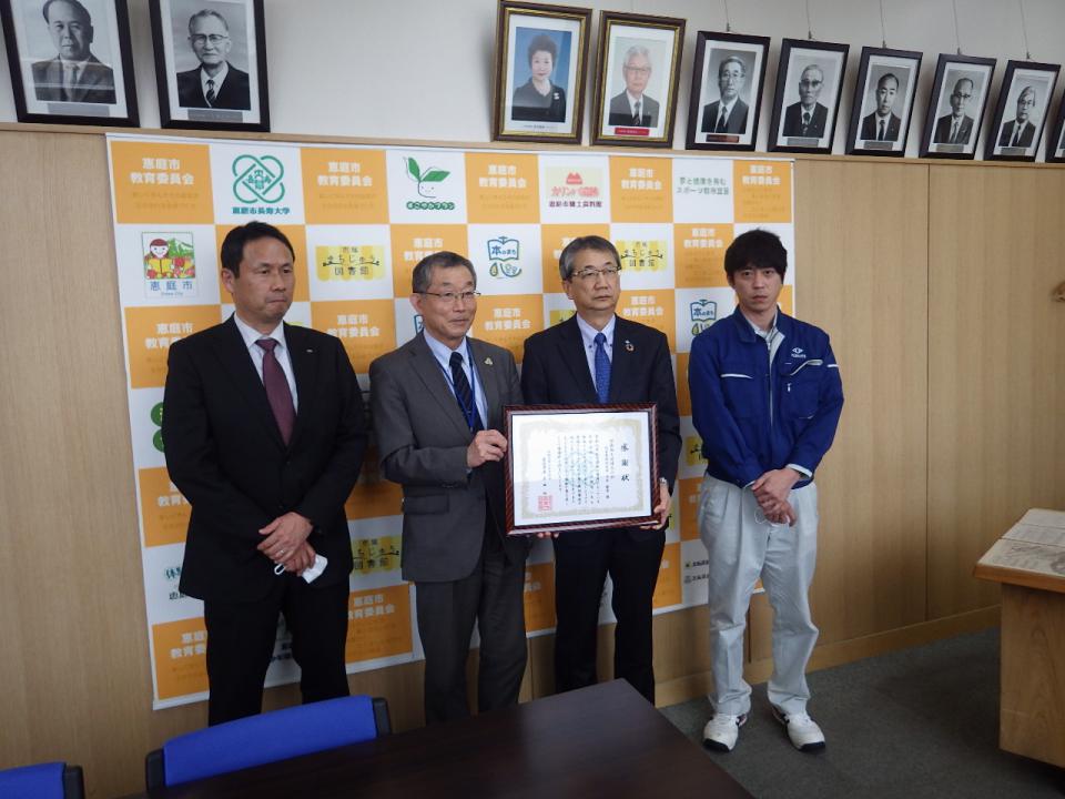令和3年2月16日、この社会貢献活動に対し恵庭市 穂積邦彦教育長から感謝状が授与されました。恵庭市民会館の教育長室で執り行われた感謝状の贈呈式には、弊社常務取締役土木本部長 中村暁彦と土木部工事課課長代理 皆木隆、柏木樋門改築工事 現場代理人 渡部真史が出席しました。