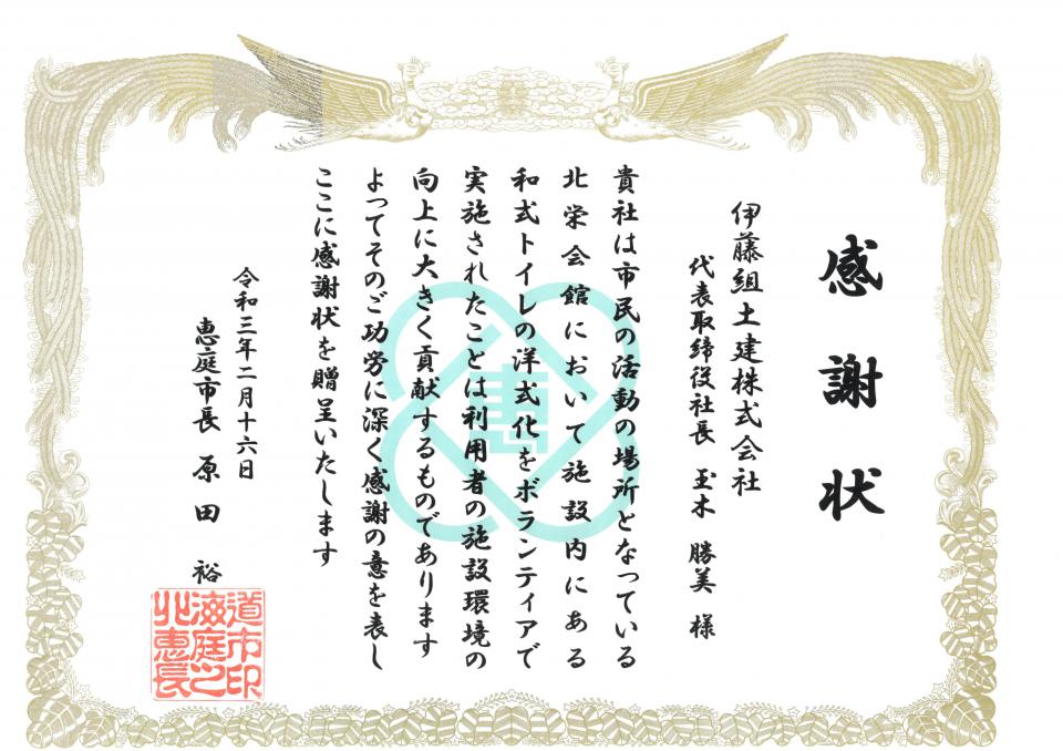 恵庭市から感謝状を頂きました