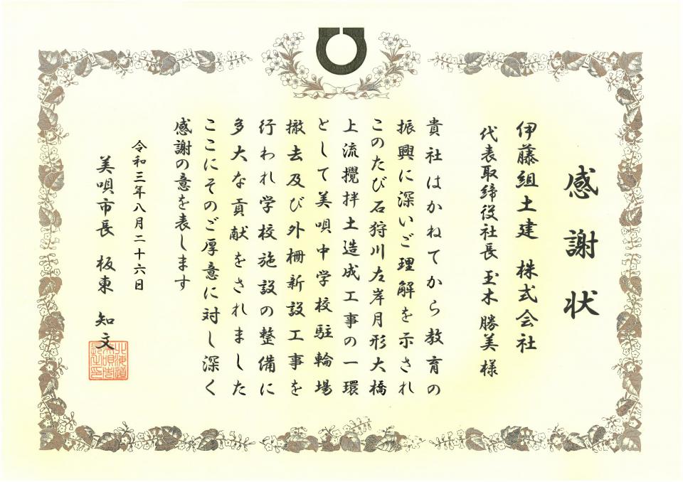 お知らせ ホーム お知らせ一覧 美唄市長より感謝状が授与されました CSR2021.09.03美唄市長より感謝状が授与されました令和3年8月5日から8月9日にかけて、美唄市立美唄中学校の破損していた駐輪場1箇所の撤去と、駐輪場と一体となっていた浸入防止柵の撤去・新設及び積雪により痛んでいたそのほかの柵を補修しました。駐輪場は、経年の豪雪で屋根を支える支柱が沈下して全体が傾いており、この冬にも倒壊する危険性があったことから撤去しました。 この活動が構内環境整備に貢献したと認められ、美唄市より整備作業に携わった4現場に対し、感謝状が授与されました。 前へお知らせ一覧に戻る一覧に戻る次へ