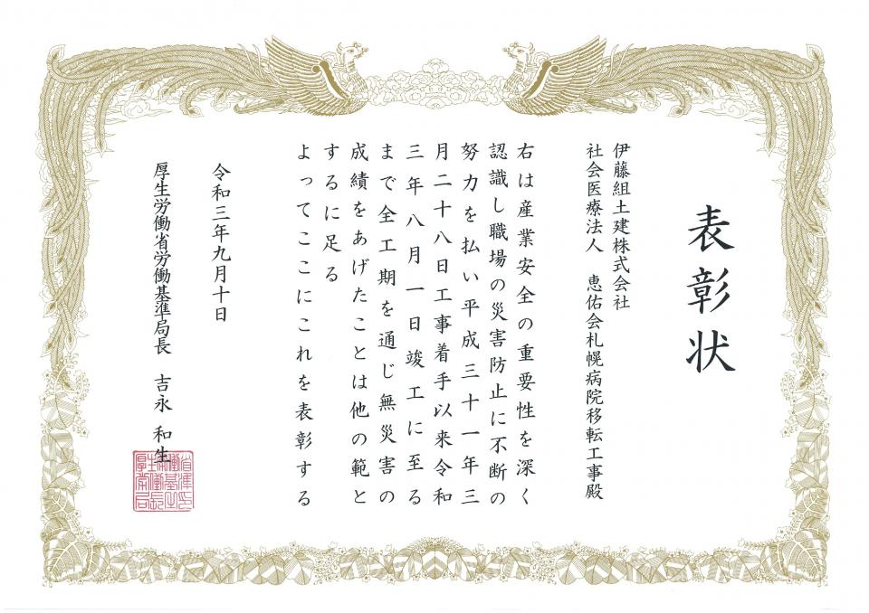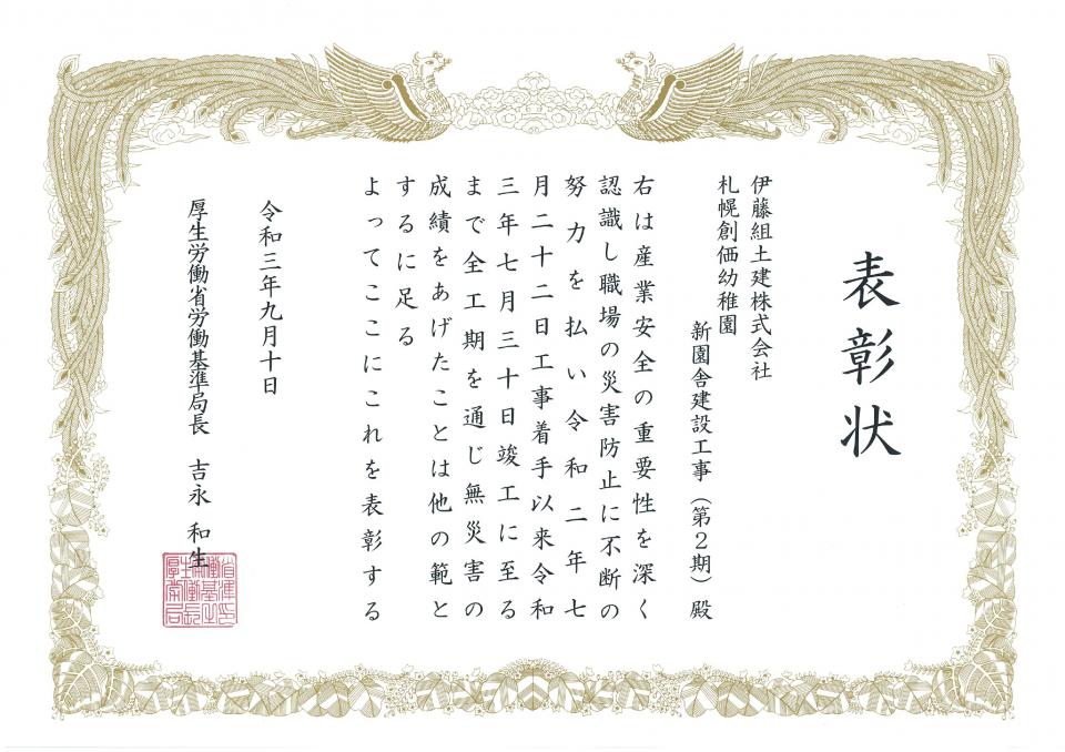お知らせ ホーム お知らせ一覧 建設事業無災害表彰を受賞しました 受賞2021.09.14建設事業無災害表彰を受賞しました令和3年9月10日、全工期を通じ無災害であった「社会医療法人恵佑会札幌病院移転工事」と「札幌創価幼稚園新園舎建設工事(第2期)」の 2現場が建設事業無災害表彰を受賞し、厚生労働省労働基準局長より表彰状が授与されました。 前へお知らせ一覧に戻る一覧に戻る次へ
