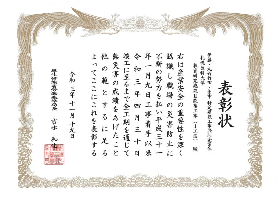 お知らせ ホーム お知らせ一覧 厚生労働省労働基準局長より表彰されました 受賞2021.11.26厚生労働省労働基準局長より表彰されました令和3年11月19日、全工期を通じ無災害であった伊藤・丸竹竹田・菱中共同企業体施工の 「札幌医科大学 教育研究施設Ⅱ改築工事(1工区)」が厚生労働省労働基準局長より表彰されました。 前へお知らせ一覧に戻る一覧に戻る次へ