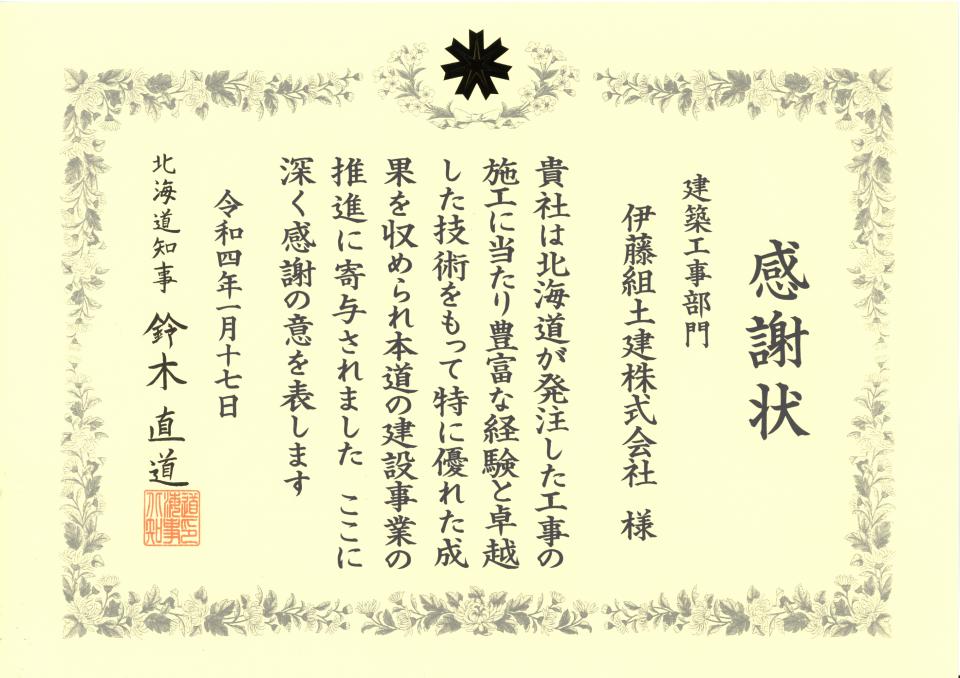 お知らせ ホーム お知らせ一覧 2021年度工事等優秀者表彰式で感謝状を授与されました 受賞2022.01.212021年度工事等優秀者表彰式で感謝状を授与されました令和4年1月17日、北海道建築局発注を対象とした2021年度工事等優秀者表彰式が執り行われ、 北海道知事より感謝状が授与されました。 前へお知らせ一覧に戻る一覧に戻る次へ