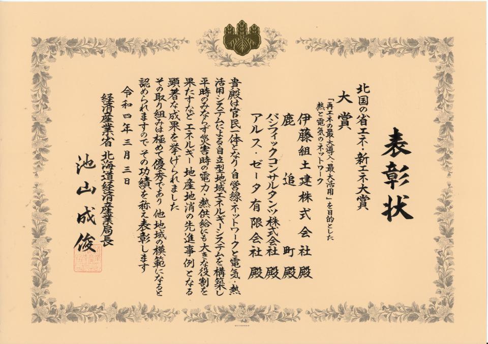 令和4年3月3日、道内の省エネ・新エネ活動を対象とした「北国の省エネ・新エネ大賞」にて「大賞」を受賞し、経済産業省北海道経済産業局長
