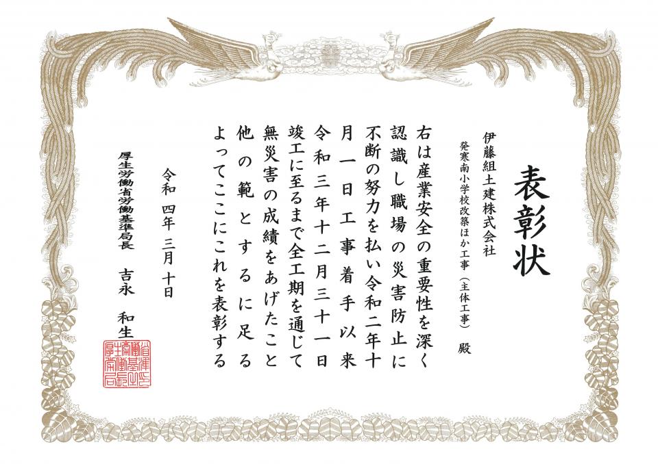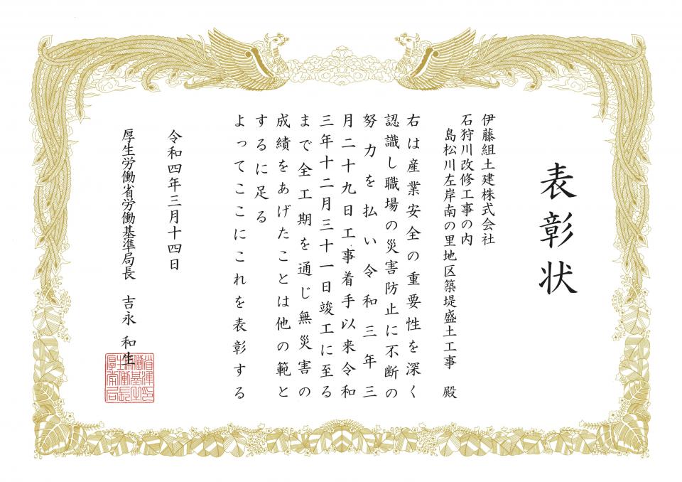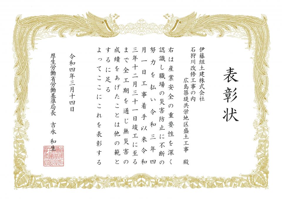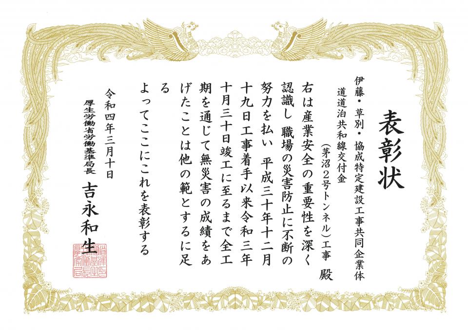 お知らせ ホーム お知らせ一覧 無災害表彰を受賞しました 受賞2022.03.25無災害表彰を受賞しましたこの度、弊社施工の6工事が無災害表彰を受賞し、厚生労働省労働基準局長より表彰状が授与されました。 【受賞工事名】 ①発寒南小学校改築ほか工事(主体工事) ②札幌大学新棟建設工事 ③道道泊共和線交付金(茅沼2号トンネル)工事 ④石狩川改修工事の内 島松川左岸南の里地区築堤盛土工事 ⑤石狩川改修工事の内 広島築堤共栄地区盛土工事 ⑥石狩川改修工事の内 石狩川左岸月形大橋上流攪拌土造成工事 前へお知らせ一覧に戻る一覧に戻る次へ