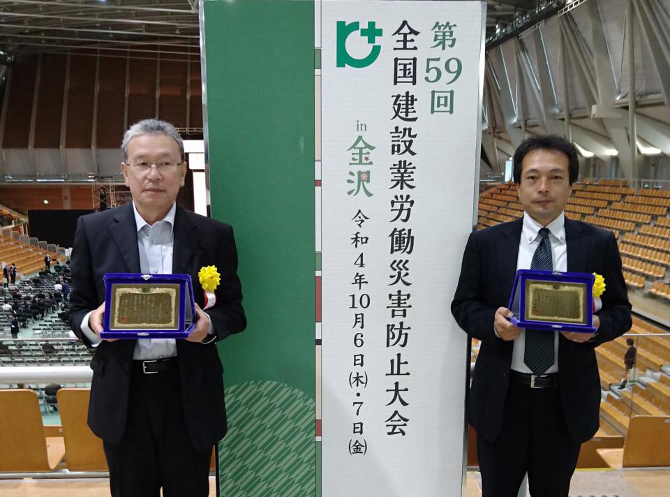 また、弊社土木部工事課所長 大橋弘明 が、建設工事現場の所長の立場で工事現場の安全衛生水準の向上に貢献したとして、安全衛生表彰功績賞(個人賞)を受賞いたしました。
