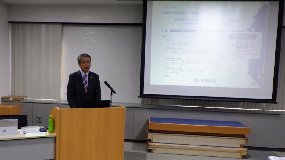 研修では、当社専務取締役 中村暁彦が、2016年から取り組んでいる働き方改革について着手の経緯と具体的なプロセスをご説明。土木本部技術部担当部長 橋本 一が、BIM/CIMの現場活用事例とその効果についてご紹介しました。