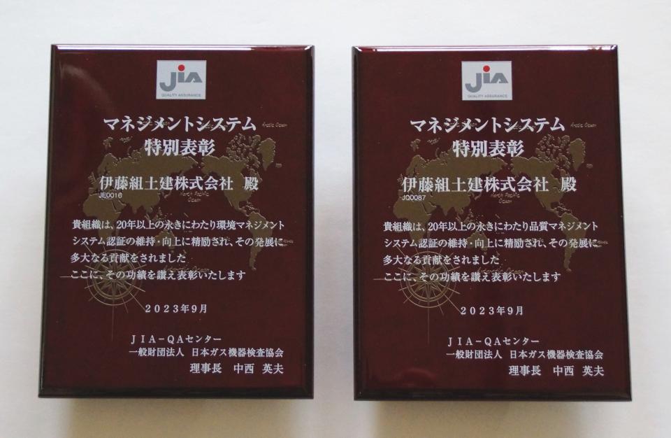 お知らせ ホーム お知らせ一覧 マネジメントシステム特別表彰を受賞しました 受賞2023.11.22マネジメントシステム特別表彰を受賞しましたこの度、JIA-QAセンター 一般財団法人 日本ガス機器検査協会から、マネジメントシステム特別表彰をいただきました。 今回の表彰は、当社が20年以上にわたり、環境マネジメントシステムおよび品質マネジメントシステム認証の維持、改善向上に努め、認証の継続を通じて制度の発展に貢献したとして贈られたものです。 当社はこれからも環境の保全、優れた工事品質のご提供に努めてまいります。 企業情報|マネジメントシステム 前へお知らせ一覧に戻る一覧に戻る次へ