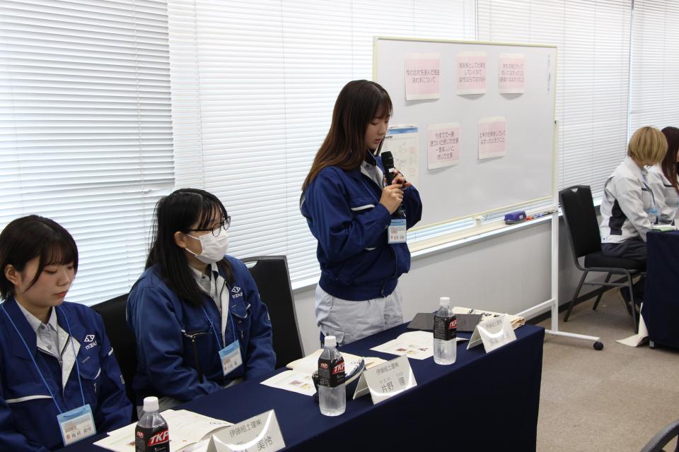 現場見学に先立って行われた座談会では、土木技術者として働くことのやりがいや普段の勤務環境、就職活動などについて、参加技術者が各自の経験を交えながら話し、終始、和やかな雰囲気で交流。その後、「白川新沈砂池新設工事」の現場を訪問し、担当者から工事概要の説明などを受けながら実際の土木工事の現場での仕事や勤務環境を体感しました。