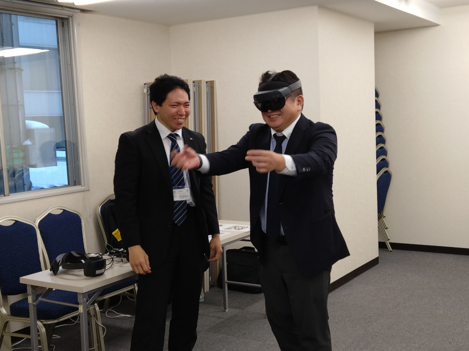 講演では、2次元図面から起こした3次元モデル等を示しながら、3次元モデル化とMRの活用内容と効果をご紹介しました。また講演の合間には会場でMR体験会を実施。参加者の方に実際にMRゴーグルを装着・操作していただき、3Dモデルによる施工段階の確認を体感していただきました。