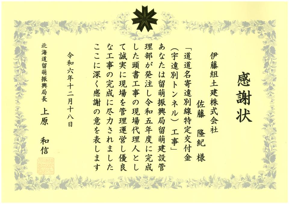 お知らせ ホーム お知らせ一覧 2024年度 留萌建管 優秀現場代理人表彰を受賞しました 受賞2024.12.192024年度 留萌建管 優秀現場代理人表彰を受賞しました12月18日、北海道留萌振興局留萌建設管理部から、道道名寄遠別線特定交付金(宇遠別トンネル)工事の現場代理人 佐藤隆紀が、誠実に現場を管理運営し優良な工事の完成に尽力したとして感謝状をいただきました。 当社ではこれからも、より質の高い工事の提供と地域への貢献のため、引き続き努力してまいります。 前へお知らせ一覧に戻る一覧に戻る次へ