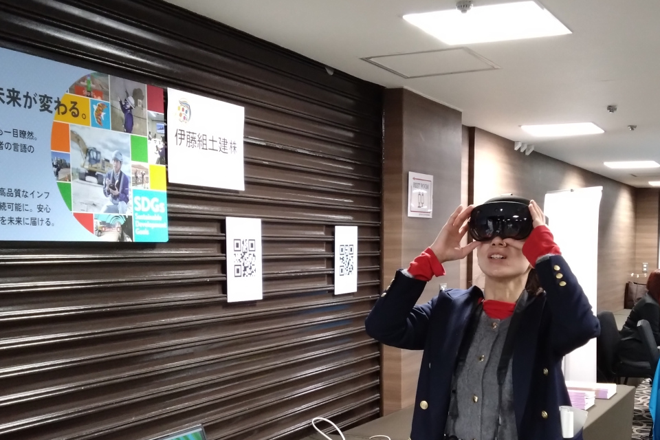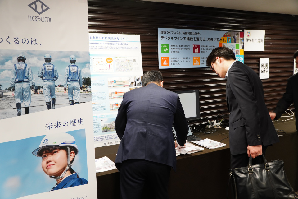 認証式に続いて開催された「SAPPOビジネスSDGsミーティング2050」では、認証企業によるパネルディスカッション等が行われ、当社常務執行役員 坂田和則が自社の取り組みや今後の課題についてお話ししました。また、会場には各社のブースが設けられ、当社は下水熱利用の仕組みとMR(複合現実)技術の活用についてご紹介。下水熱の活用については、同日から供用を開始した札幌市中央区複合庁舎で導入されていることもあり、多くの方に関心を持っていただきました。