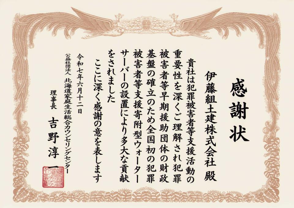 当社は、売上金の一部が犯罪被害者とその家族および遺族の被害回復と軽減のための援助活動資金に活用される「犯罪被害者等支援寄付型ウォーターサーバー」を現場事務所に設置しています。これは全国初の取り組みで、6月12日に行われた授賞式では、当社副社長 阪 豊彦が、北海道家庭生活総合カウンセリングセンター 吉野純一理事長から、犯罪被害者等早期援助団体の財政基盤の確立のため多大な貢献をしたとして感謝状をいただきました。