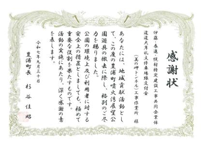 道道大岸礼文停車場線交付金(美の岬トンネル)工事における地域社会貢献活動の一環として行った、豊浦町噴火湾展望公園の老朽化した遊具の撤去に対し、公園の環境及び利用者の安全対策に貢献したとして、当社を含む伊藤・泰進・幌村特定建設工事共同企業体に感謝状が授与されました。
