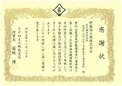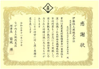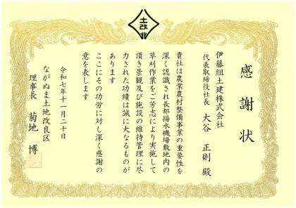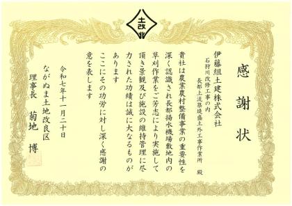 11月20日、ながぬま土地改良区から、当社の草刈ボランティアに対し、景観及び施設の維持管理に尽力したとして感謝状をいただきました。