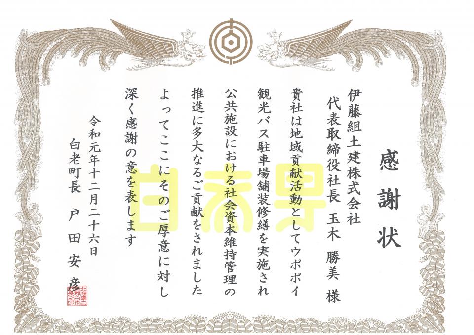 お知らせ ホーム お知らせ一覧 白老町長より感謝状を頂きました CSR2019.12.26白老町長より感謝状を頂きました令和元年12月26日、白老町長より感謝状を頂きました。 この感謝状は、地域貢献活動としてウポポイ観光バス駐車場舗装修繕を実施し、 公共施設の管理推進に大きく貢献したことに対して贈られました。 前へお知らせ一覧に戻る一覧に戻る次へ