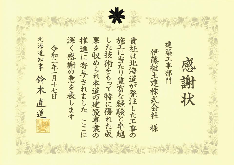 お知らせ ホーム お知らせ一覧 北海道知事より感謝状を頂きました 受賞2020.01.17北海道知事より感謝状を頂きました令和2年1月17日、北海道知事より感謝状を頂きました。 この感謝状は、道が発注した工事の施工に当たり、 特に優れた成果を収めたことに対して贈られました。 前へお知らせ一覧に戻る一覧に戻る次へ