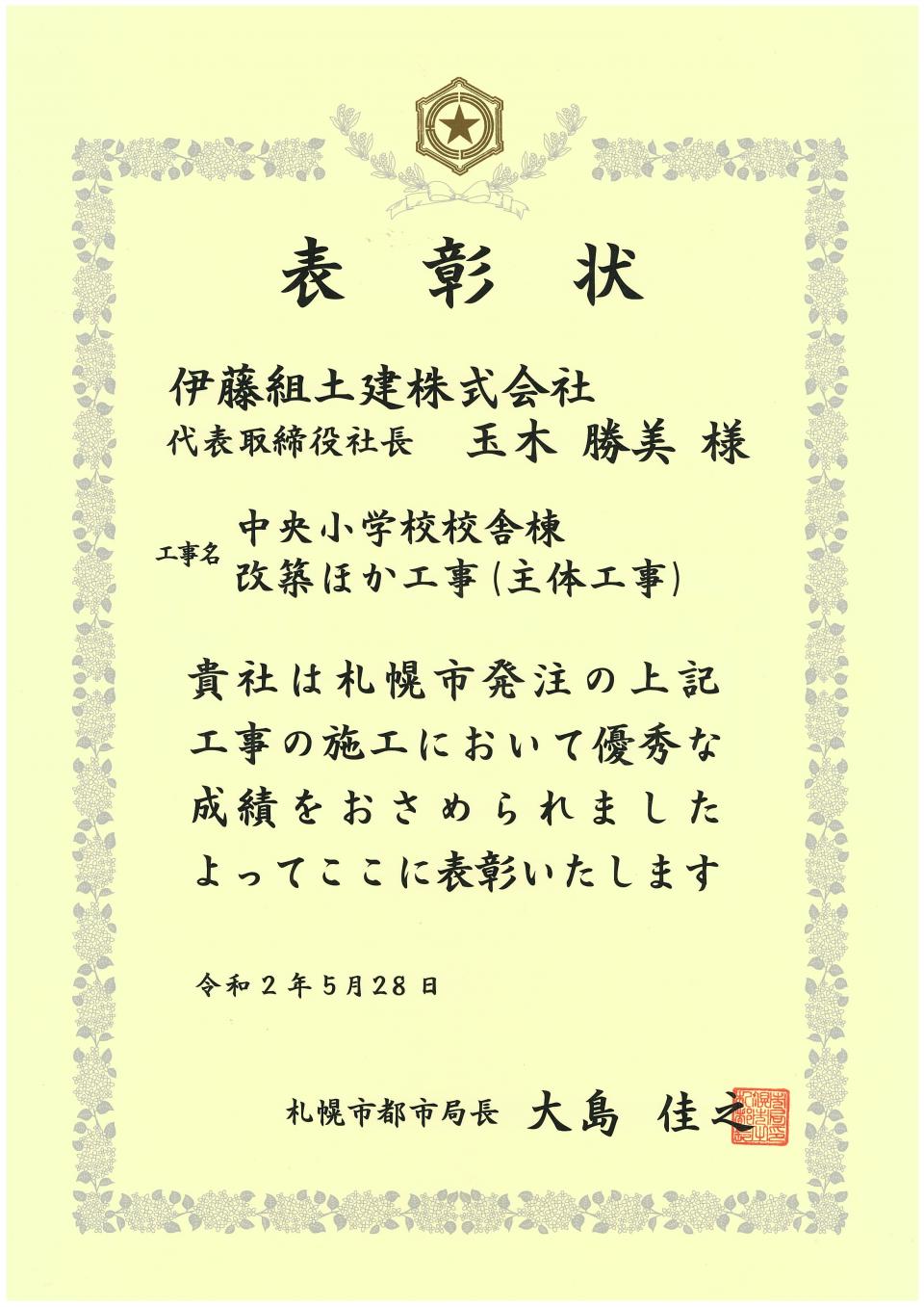 お知らせ ホーム お知らせ一覧 札幌市都市局より表彰状を頂きました 受賞2020.06.16札幌市都市局より表彰状を頂きました令和2年5月28日、札幌市都市局より表彰状を頂きました。 この表彰状は、札幌市が発注した工事の施工にあたり、 優秀な成績を収めたことに対して贈られました。 前へお知らせ一覧に戻る一覧に戻る次へ