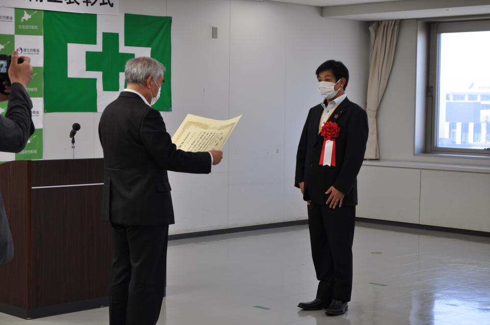 令和4年7月6日に札幌第一合同庁舎で開催された表彰伝達式では、北海道労働局長 友藤智朗 様より、本工事所長 原田英一に表彰状が伝達されました。