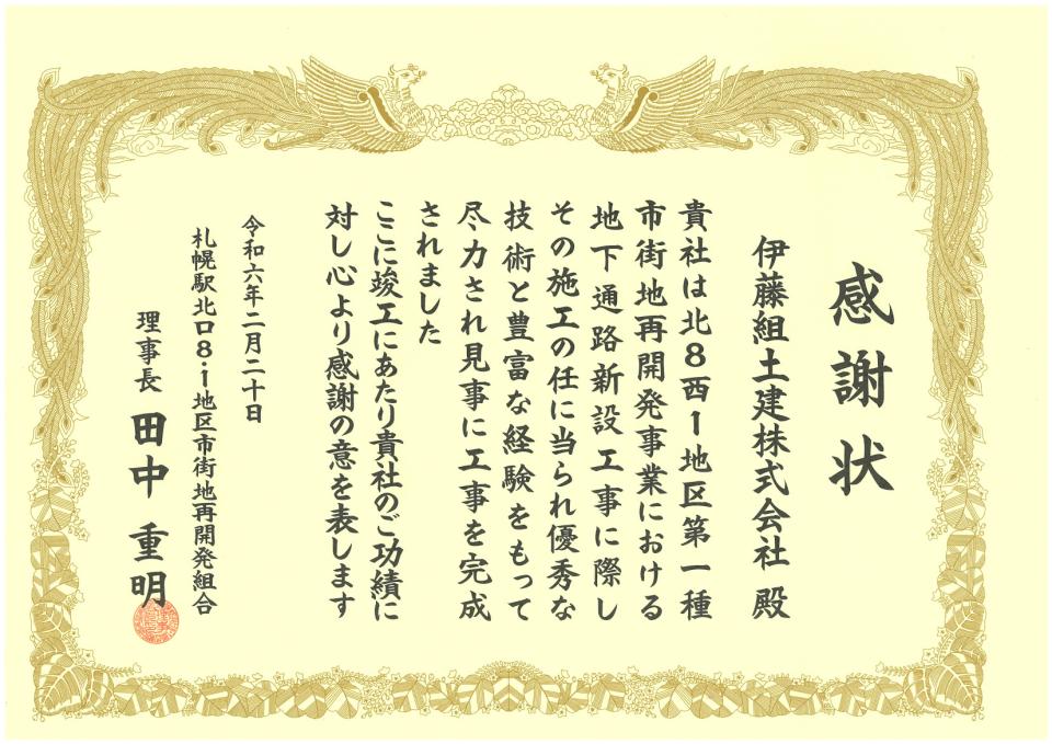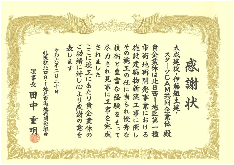 お知らせ ホーム お知らせ一覧 札幌駅北口8・1地区市街地再開発組合から感謝状をいただきました 受賞2024.02.20札幌駅北口8・1地区市街地再開発組合から感謝状をいただきました2月20日、北8西1地区第一種市街地再開発事業における地下通路新設工事及び、施設建築物新築工事の施工に対し、優秀な技術と豊富な経験をもって工事の完成に尽力したとして、札幌駅北口8・1地区市街地再開発組合から感謝状を授与されました。 当社はこれからも最良の品質の工事をご提供できるよう、さらなる技術の向上に努めてまいります。 前へお知らせ一覧に戻る一覧に戻る次へ