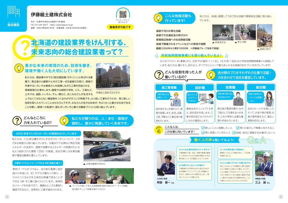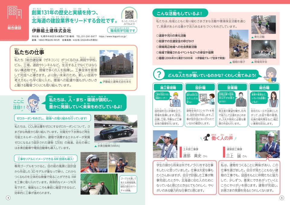 今回当社が掲載された副教材「お仕事ブック」「お仕事ノート」では、札幌市内のさまざまな業界の企業が紹介されており、当社については「総合建設」としてゼネコンの仕事概要や当社の特長、どのような職種の人が働いているかなどが、児童・生徒向けにやさしく説明されています。