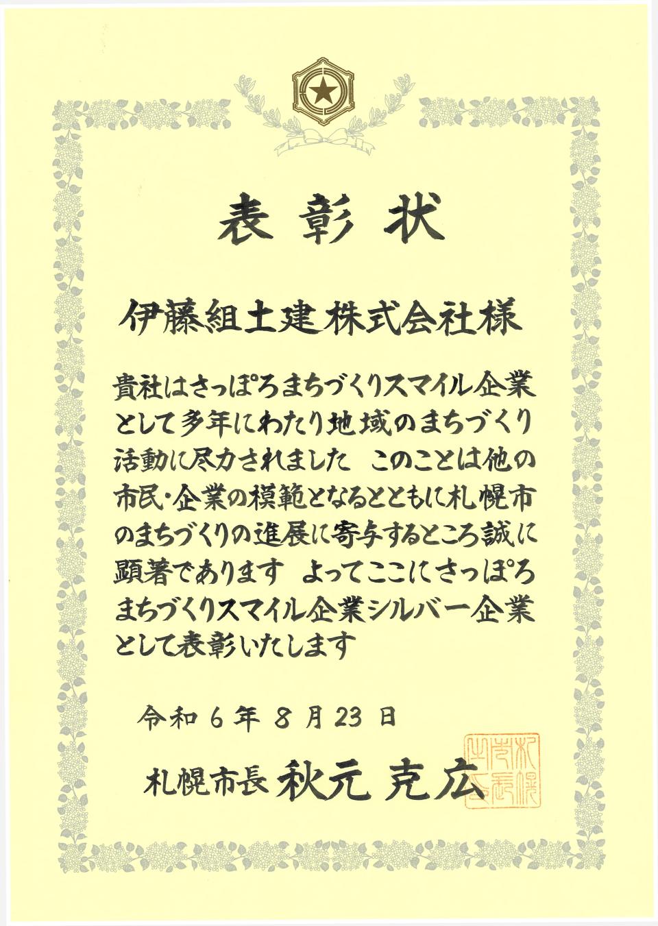 8月23日に行われた表彰式では、秋元克広 札幌市長から代表取締役社長 大谷正則へ表彰状が授与されました。