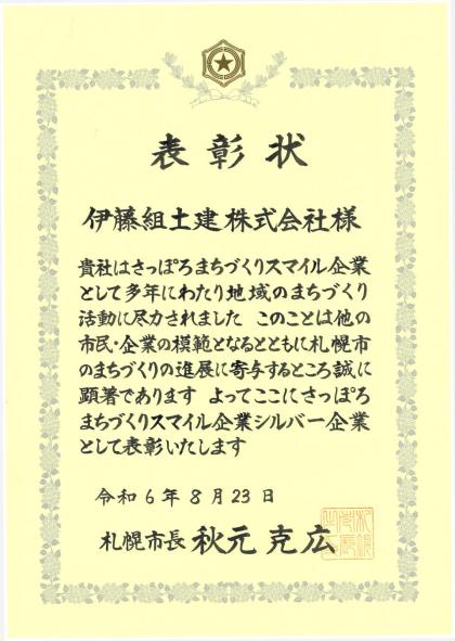 札幌市から「さっぽろまちづくりスマイル企業 シルバー企業」として認定・表彰されました