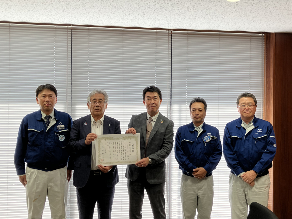 授与式には常務執行役員土木本部長 新沼寛明、土木部次長 煤田昌也、現場代理人・監理技術者 岩間寛が出席し、杉谷佳昭町長から感謝状を受け取りました。