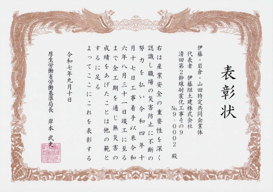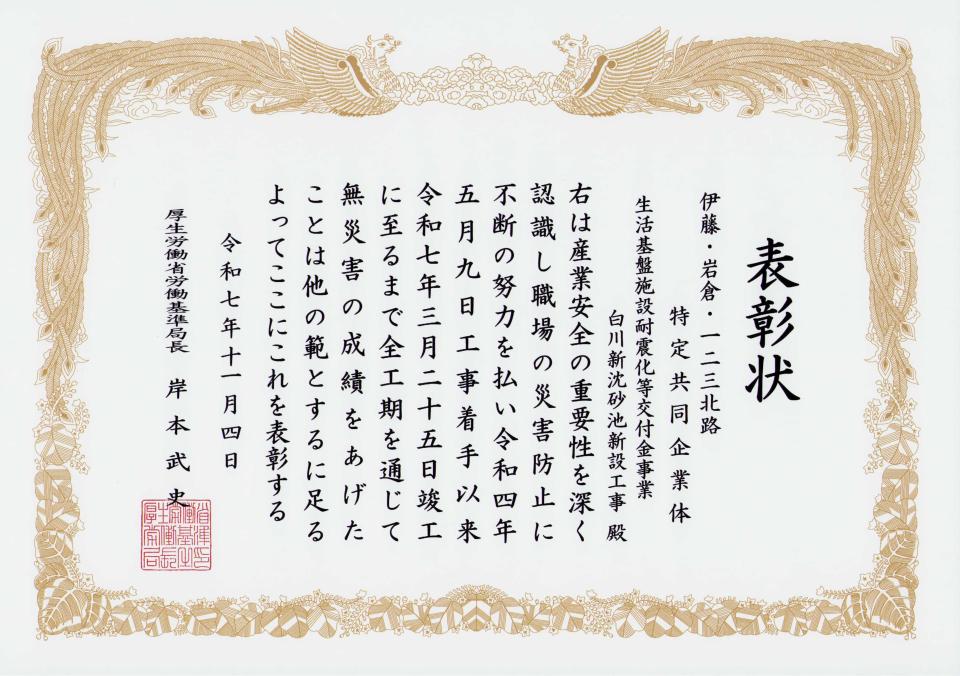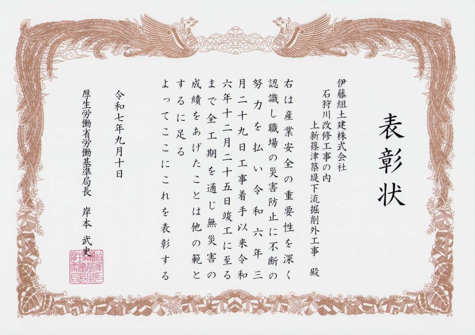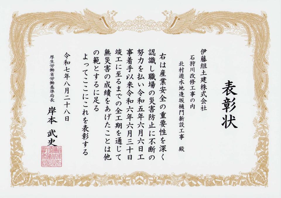 この度、全工期を通じて無災害の成績を達成した当社施工の下記6工事が、「建設業無災害表彰」を受賞し、厚生労働省労働基準局長から表彰状が授与されました。