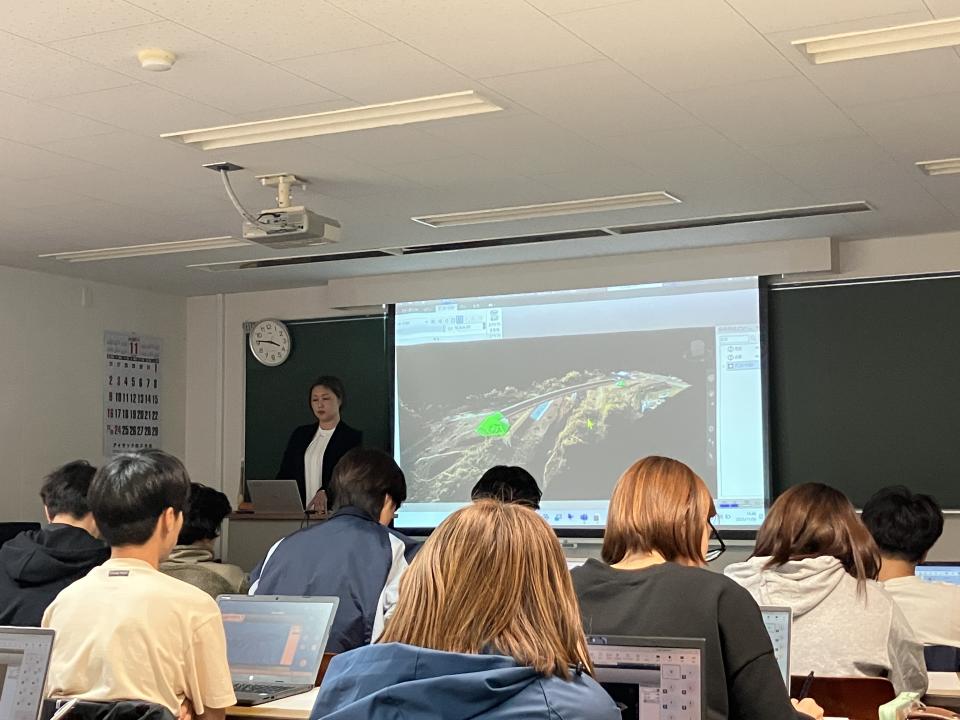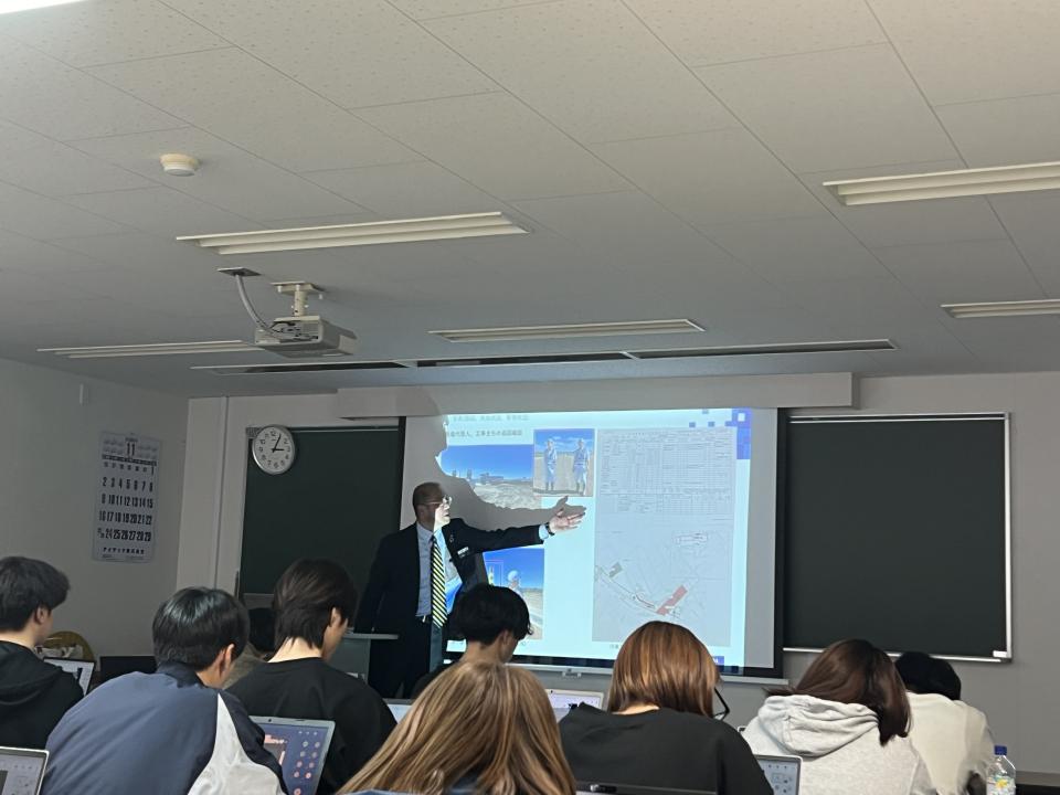 橋本は、ICT施工におけるUAV(ドローン)や3Dスキャナによる地形測量、設計データとの照合、出来形管理の効率化などを実例とともに紹介。ICT導入によって得られる施工精度や安全性の向上について、学生の皆さんにわかりやすく説明しました。