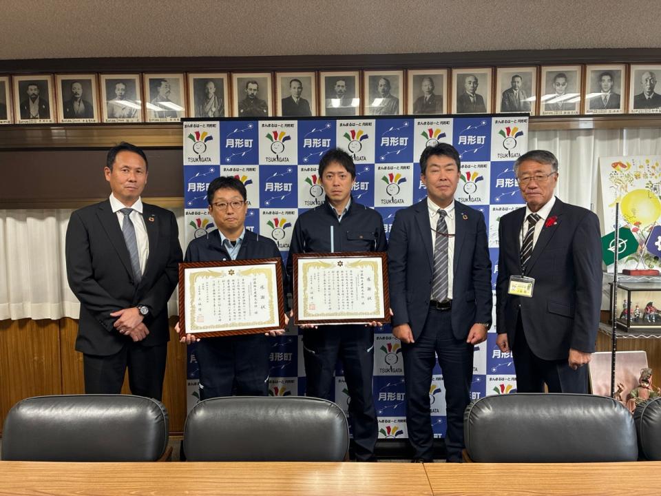 授与式には常務執行役員土木本部長 新沼寛明、土木部担当部長 皆木隆、札比内築堤中小屋川樋門下流掘削外工事現場代理人・監理技術者 髙橋薫、北村遊水地西工区周囲堤外工事所長・現場代理人 渡部真史が出席し、上坂隆一町長から感謝状を受け取りました。