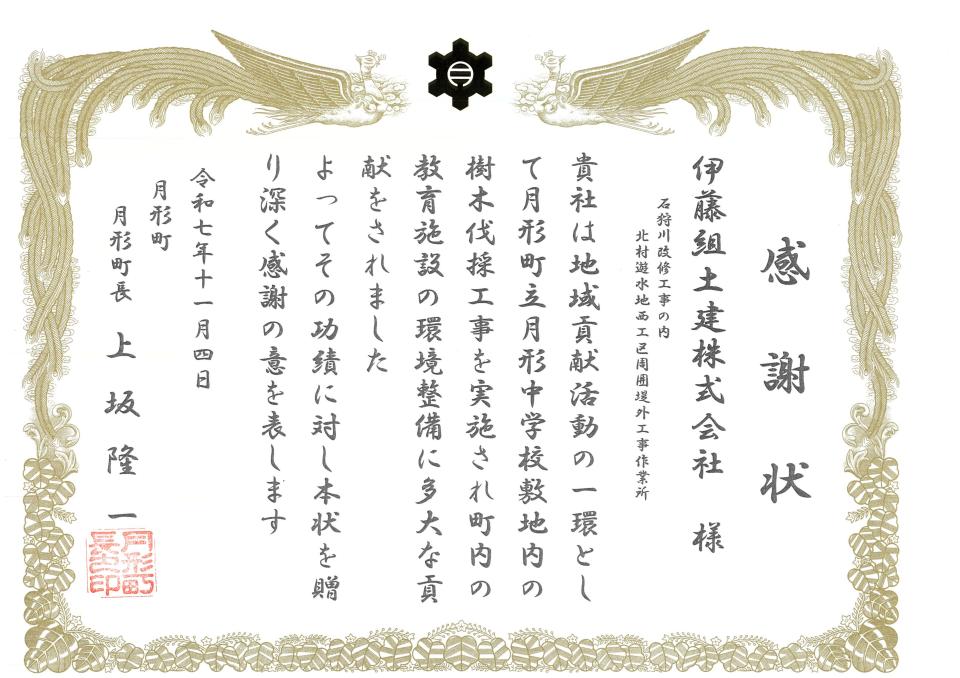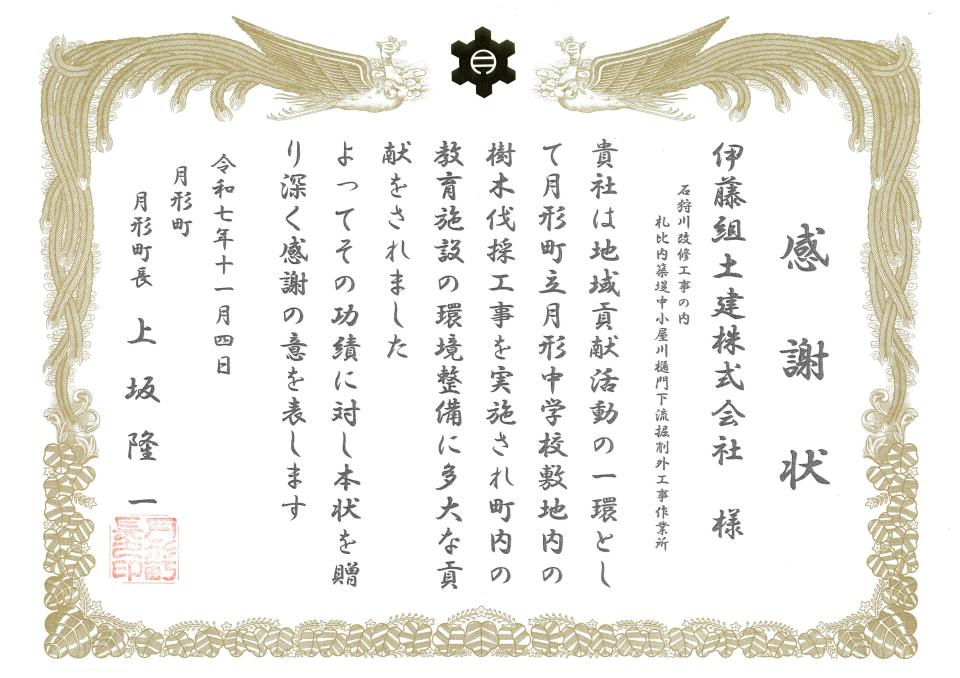 石狩川改修工事の内 札比内築堤中小屋川樋門下流掘削外工事と北村遊水地西工区周囲堤外工事作業所が共同で行った、町立月形中学校の敷地内にある倒木の恐れのある樹木の伐採作業に対し、敷地に出入りする生徒や付近を通行する住民の安全対策に貢献したとして、月形町長から感謝状が授与されました。