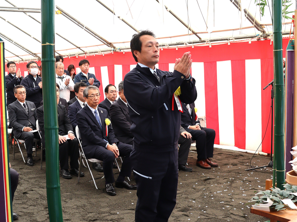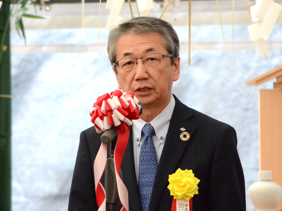 施工者を代表して登壇した当社専務取締役 中村暁彦は、「地域の自然環境に十分配慮し、無事故で高品質な施工ができるよう努めたい」と工事に向かう決意を述べ、「地域の皆様の生活、産業や観光の振興と利便性の向上に微力ながら貢献したい」と挨拶しました。