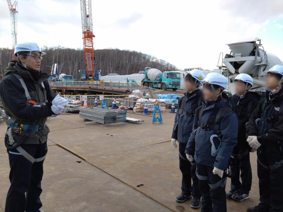 当社では、建設業やゼネコンについての説明や、作業服とフルハーネスを着用しての現場見学、また測量にも挑戦し、実際の仕事の一端に触れてもらいました。