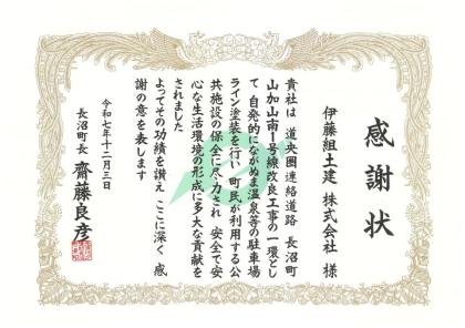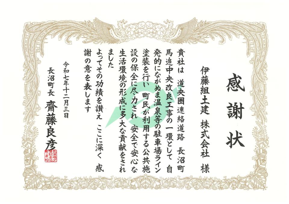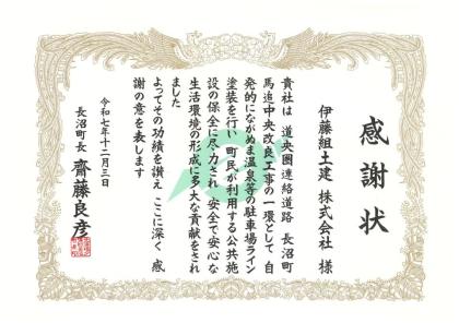 地域社会貢献活動の一環として行った長沼町の公共施設(ながぬま温泉・馬追の名水・長沼町図書館・長沼町スポーツセンター)の駐車場のライン塗装に対し、安全で安心な生活環境の形成に貢献したとして、長沼町長から感謝状が授与されました。