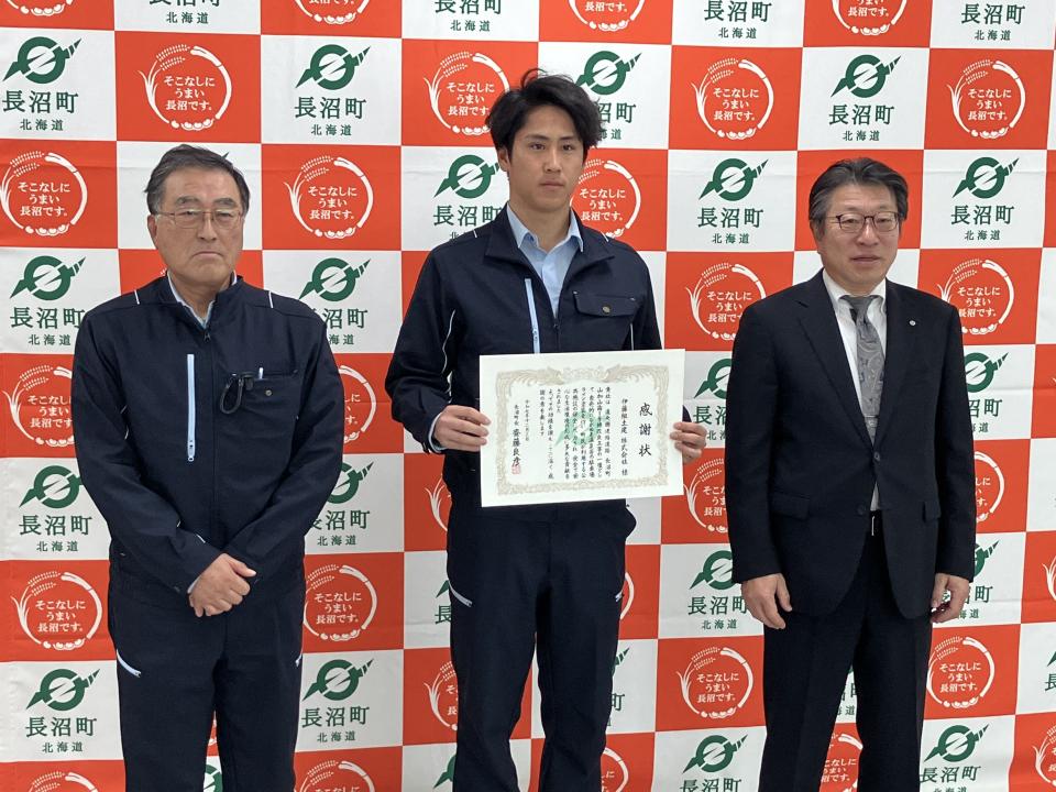 授与式には、ボランティア活動を行った道央圏連絡道路 長沼町 馬追中央改良工事 監理技術者 東栄治、道央圏連絡道路 長沼町 山加山南1号線改良工事 現場代理人 後藤佑斗が出席し、齋藤 良彦町長から感謝状を受け取りました。