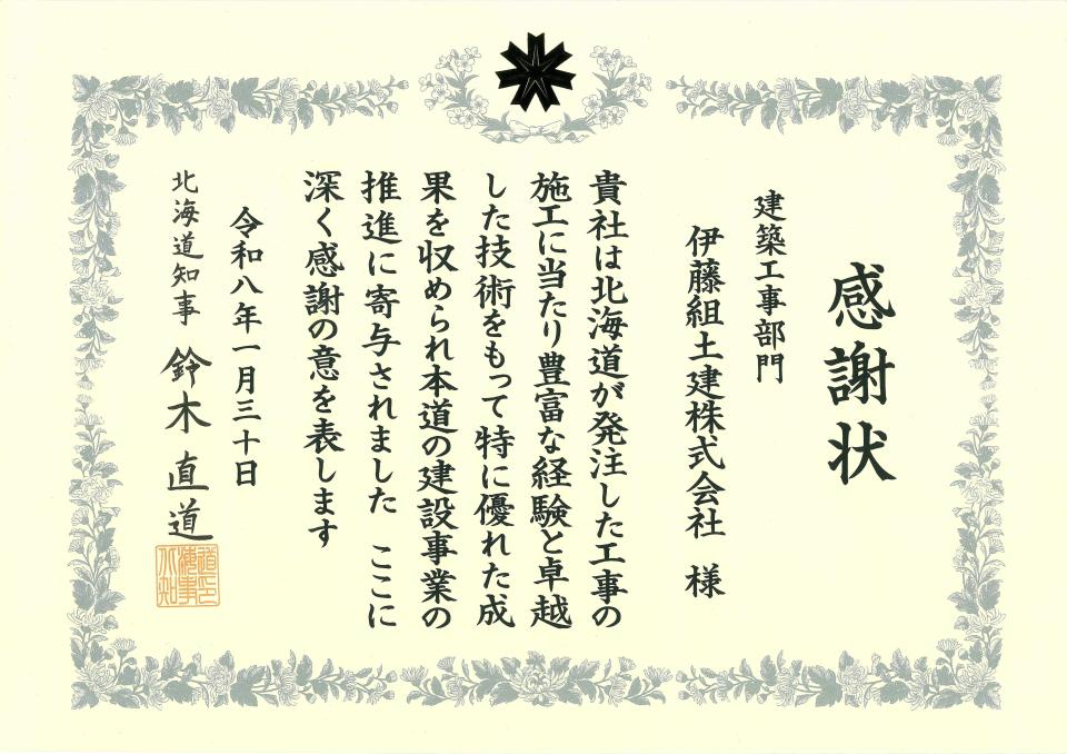 1月30日、2025年度における北海道建設部発注の工事において、施工成績等が特に優秀であったとして北海道知事から感謝状をいただきました。