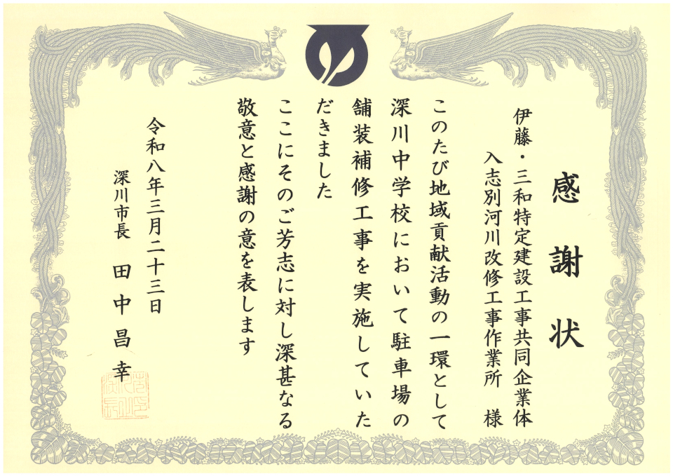 入志別川広域河川改修工事における地域社会貢献活動の一環として行った舗装補修工事が評価され、深川市長から感謝状を授与されました。
