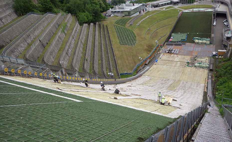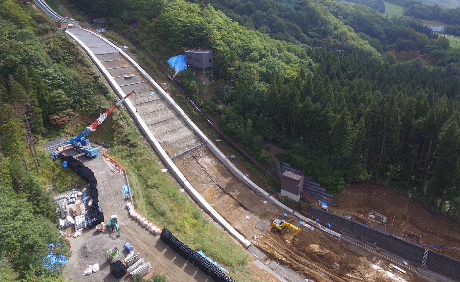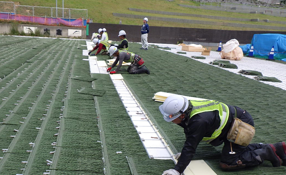 自然環境との調和を図るため、のり面や河川敷に芝や在来種を植え付ける工程です。植物の根による補強効果で浸食を抑えつつ、地域の生態系を守る役割も担います。「守る」と「育てる」を同時に行う、環境配慮型の工事です。